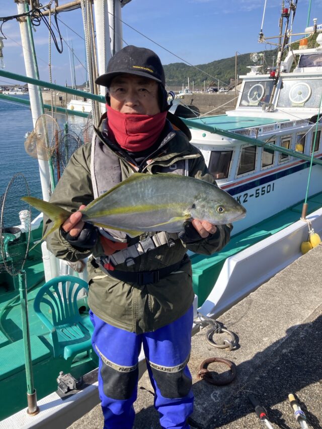 村上さん、シマアジ1匹.次、1.1.0匹でした,下り潮早く二枚潮きつく釣りにかった。他、ヤイト、メイチ、真鯛でした。